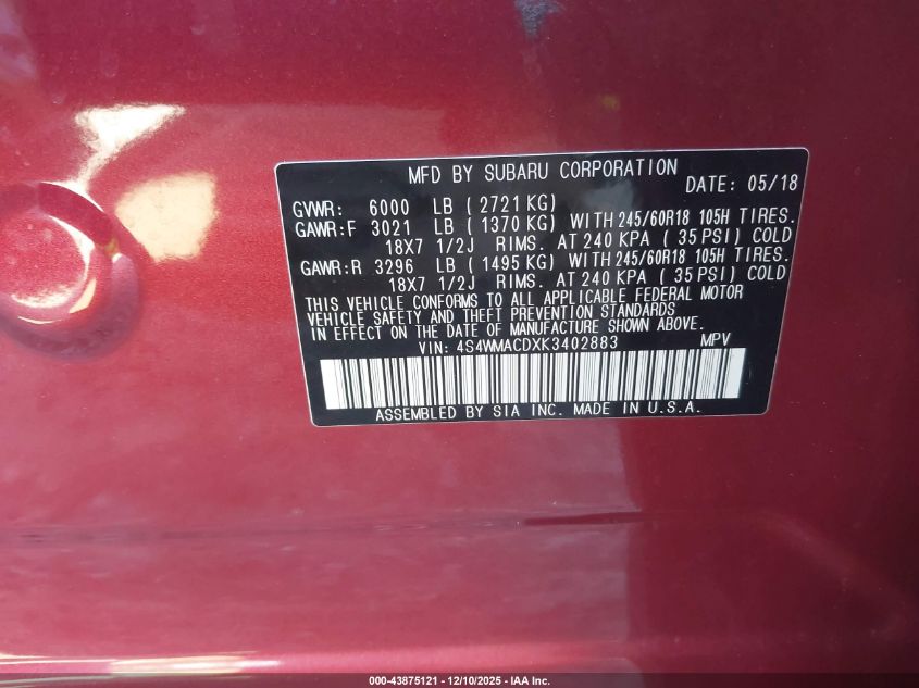 2019 SUBARU ASCENT 2019 року Бензин, 2.4, Повний привід, vin - 4S4WMACDXK3402883 з США