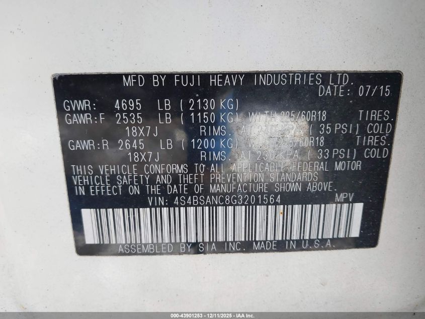 2016 SUBARU OUTBACK 2.5I LIMITED