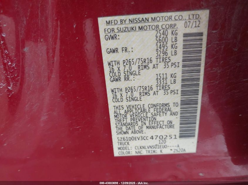 2012 SUZUKI EQUATOR 2012 року Бензин, 4.0, Повний привід, vin - 5Z61D0EV3CC470251 з США