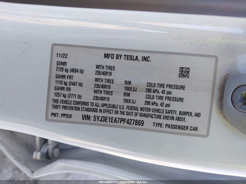 2023 TESLA MODEL 3 2023 року Електричний, U, Задній привід, vin - 5YJ3E1EA7PF427869 з США