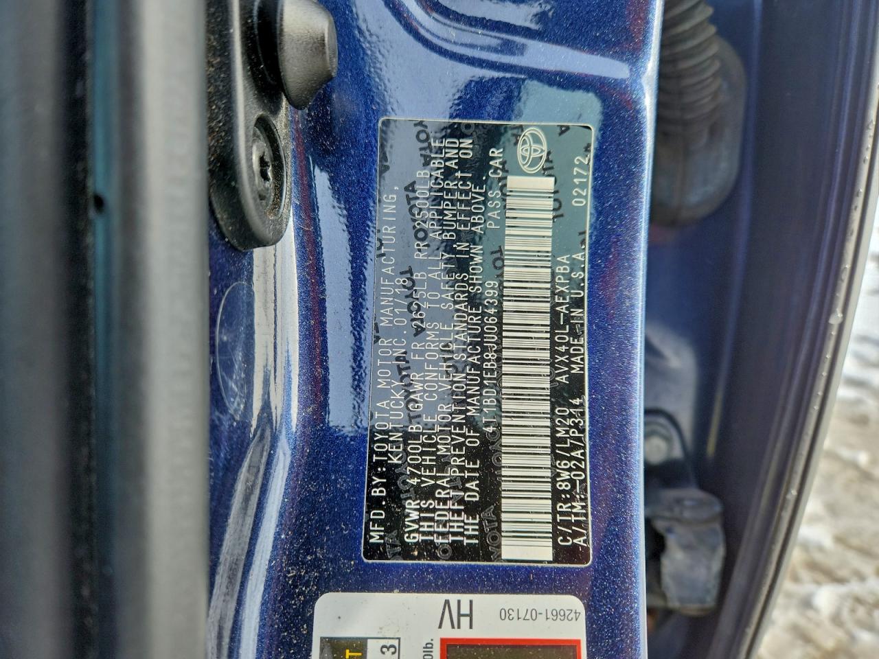 Колір СинійЦиліндри 4VIN 4T1BD1EB8JU064399Стан Заводиться та їде (перевірено)Ушкодження Передня або задняДата аукціону 2025-12-08 AutoRIA