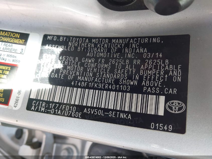 2014 TOYOTA CAMRY 2014 року Бензин, 2.5, Передній привід, vin - 4T4BF1FK9ER401103 з США
