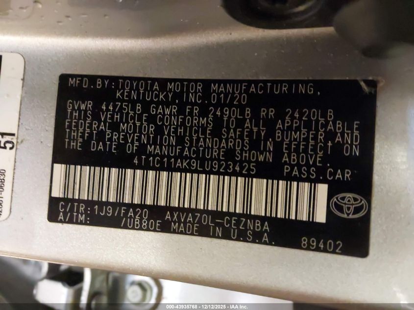 2020 TOYOTA CAMRY LE