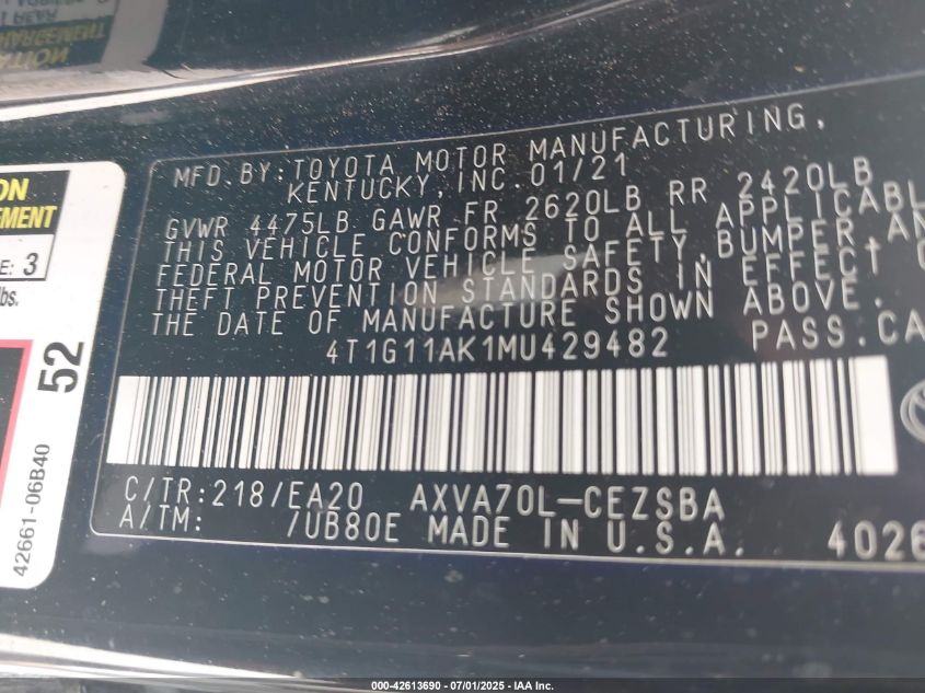 2021 TOYOTA CAMRY 2021 року Бензин, 2.5, Передній привід, vin - 4T1G11AK1MU****** з США