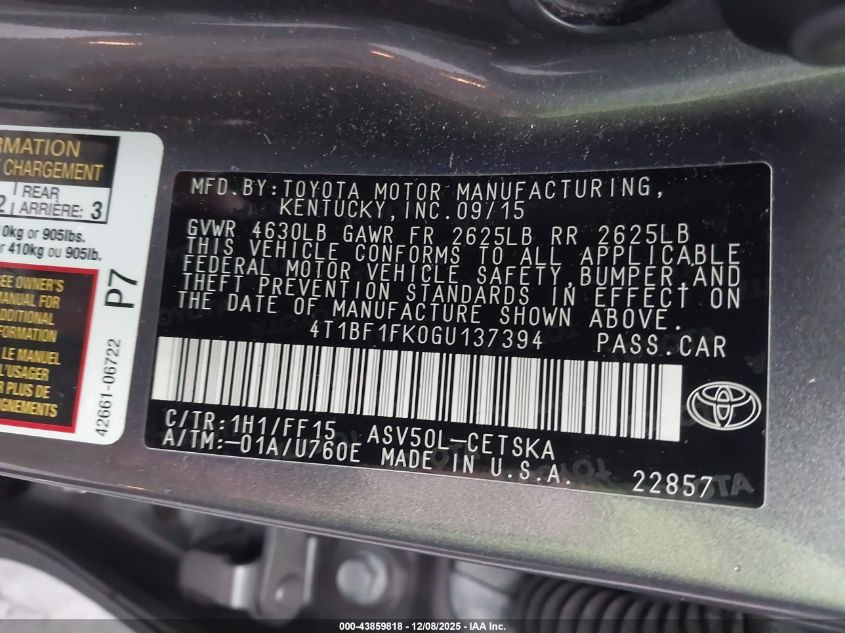 2016 TOYOTA CAMRY 2016 року Бензин, 2.5, Передній привід, vin - 4T1BF1FK0GU137394 з США