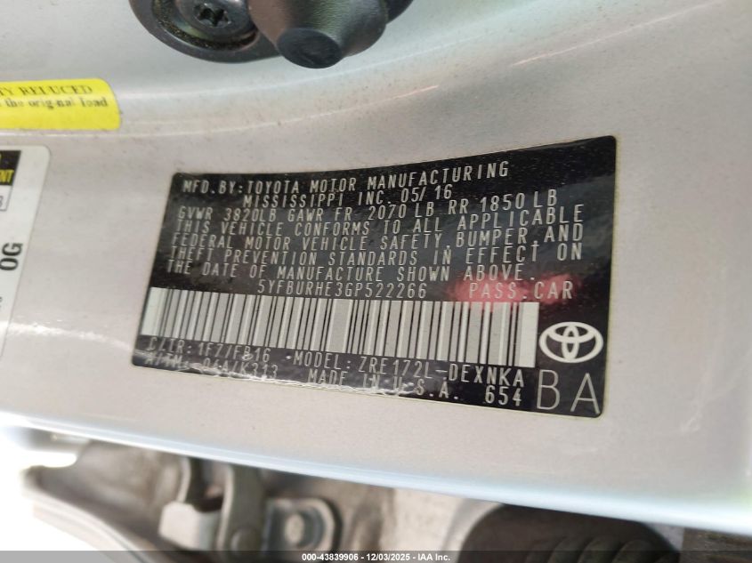 2016 TOYOTA COROLLA L