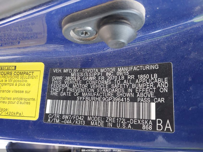 2016 TOYOTA COROLLA L