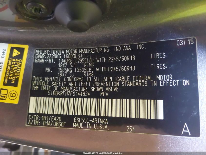 Колір СірийЦиліндри 6Привід Повний привідVIN 5TDBKRFH7FS******Стан НевідомоУшкодження Передня і задня Дата аукціону 2025-09-16