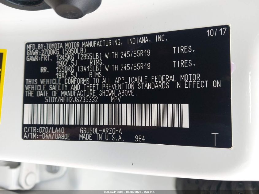 2018 TOYOTA HIGHLANDER 2018 року Бензин, 3.5, Передній привід, vin - 5TDYZRFH2JS****** з США