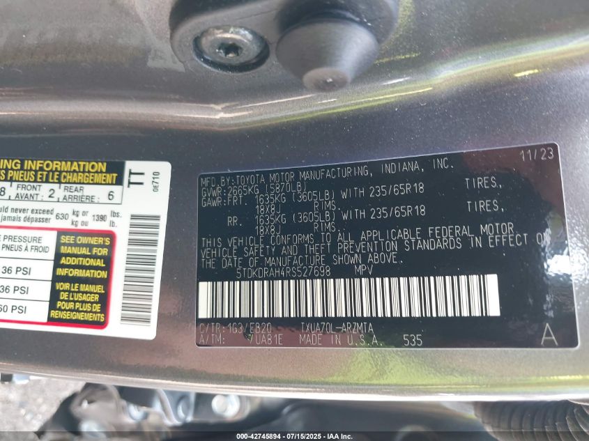 2024 TOYOTA HIGHLANDER 2024 року Бензин, 2.4, Передній привід, vin - 5TDKDRAH4RS****** з США