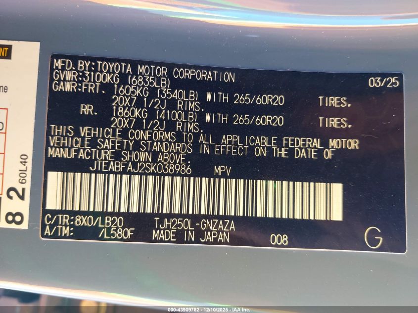 2025 TOYOTA LAND CRUISER 2025 року Гібрид, 2.4, Повний привід, vin - JTEABFAJ2SK038986 з США