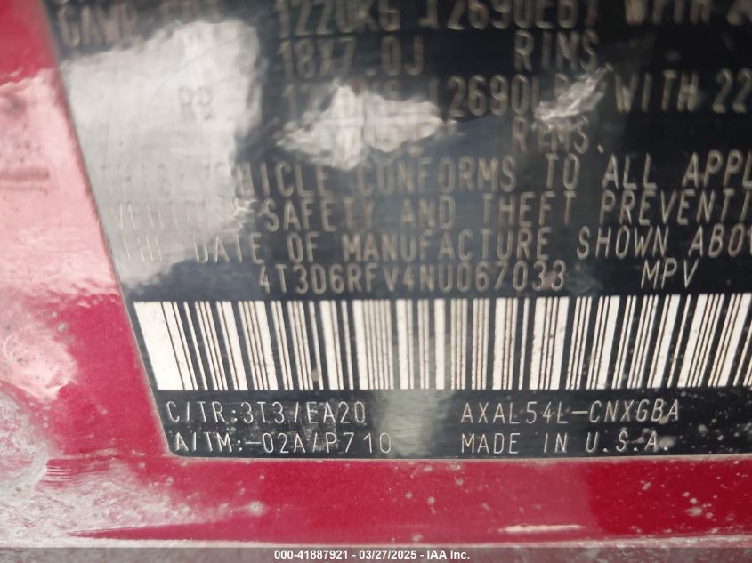 Колір ЧервонийЦиліндри 4Привід Повний привідVIN 4T3D6RFV4NU067033Стан Заводиться та їде (перевірено)Ушкодження ДахДата аукціону 2025-11-20