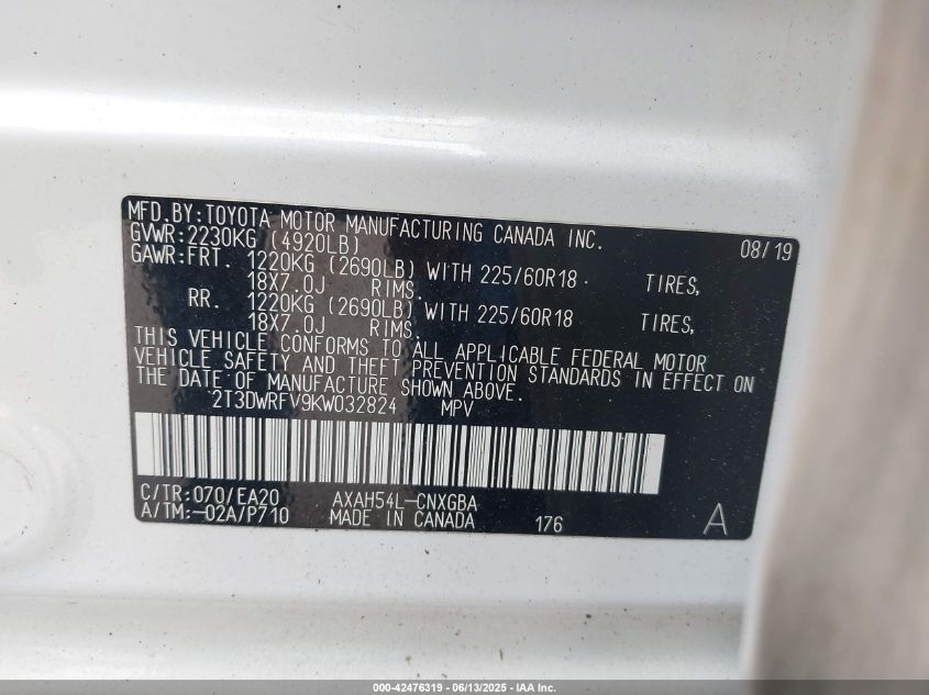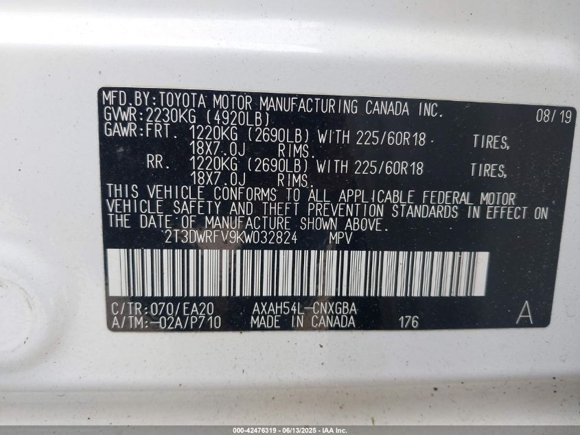 2019 TOYOTA RAV4 HYBRID 2019 року Гібрид, 2.5, Повний привід, vin - 2T3DWRFV9KW****** з США