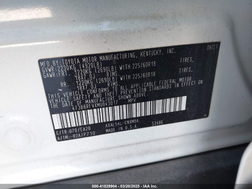 2021 TOYOTA RAV4 HYBRID 2021 року Гібрид, 2.5, Повний привід, vin - 4T3B6RFVXMU043017 з США