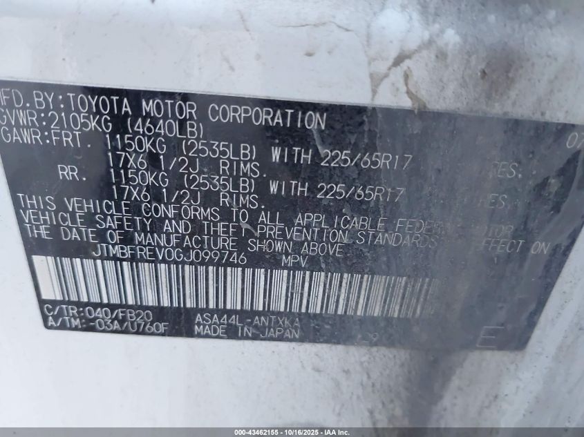 Колір БілийЦиліндри 4Привід Повний привідVIN JTMBFREV0GJ099746Стан СтаціонарноУшкодження Передня або задняДата аукціону 2025-12-18 AutoRIA