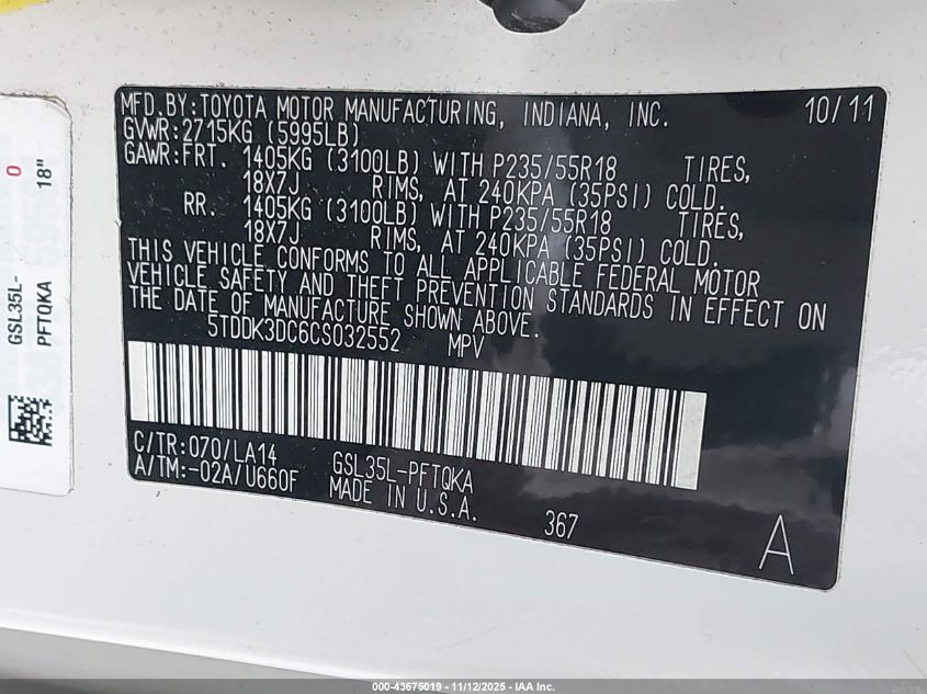 Колір БілийЦиліндри 6Привід Повний привідVIN 5TDDK3DC6CS032552Стан Заводиться та їде (перевірено)Ушкодження Задня права AutoRIA