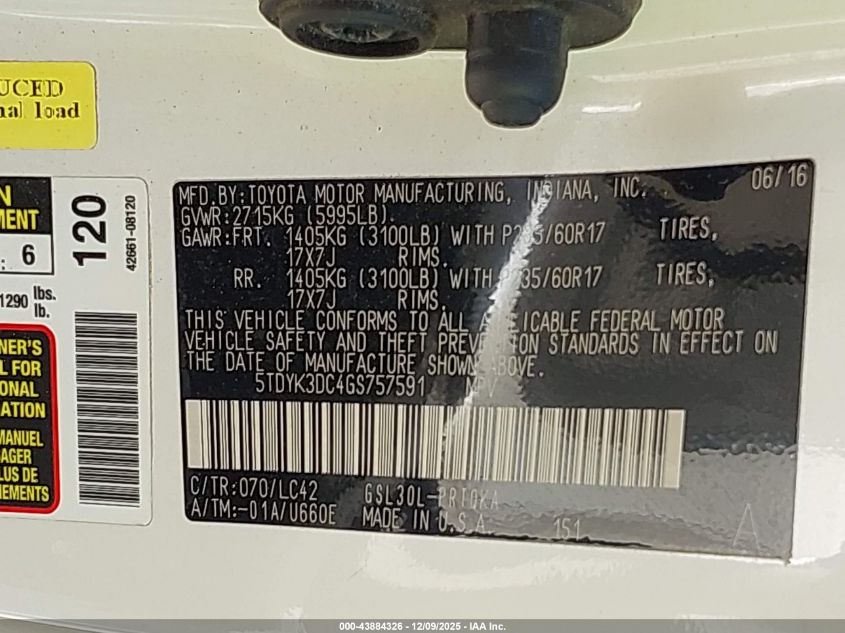 2016 TOYOTA SIENNA 2016 року Бензин, 3.5, Передній привід, vin - 5TDYK3DC4GS757591 з США