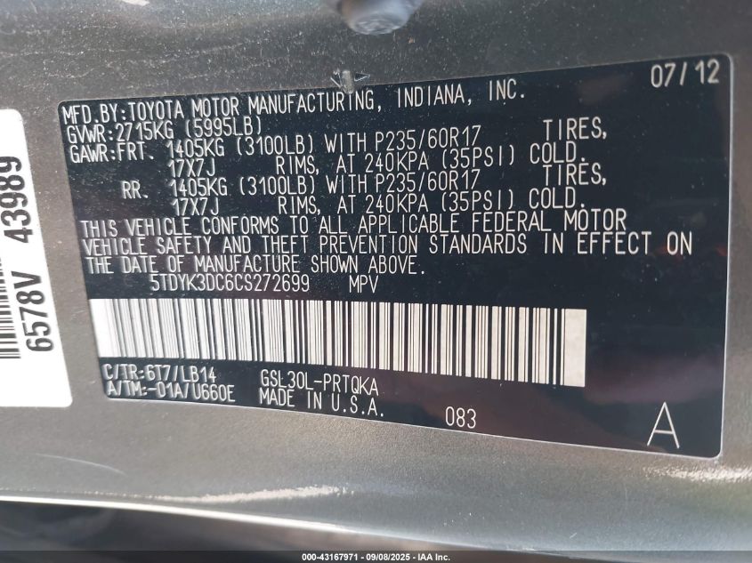 Колір СірийЦиліндри 6Привід Передній привідVIN 5TDYK3DC6CS272699Стан Заводиться та їде (перевірено)Ушкодження Передня права AutoRIA