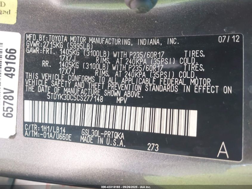 2012 TOYOTA SIENNA 2012 року Бензин, 3.5, Передній привід, vin - 5TDYK3DC5CS277148 з США