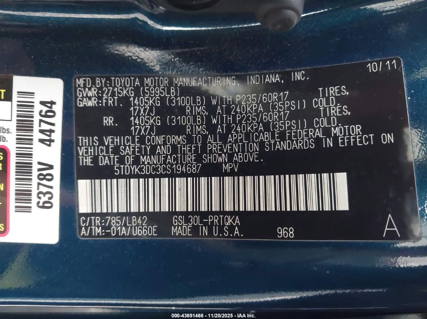Колір СинійЦиліндри 6Привід Передній привідVIN 5TDYK3DC3CS194687Стан Заводиться та їде (перевірено)Ушкодження Передня або задня AutoRIA