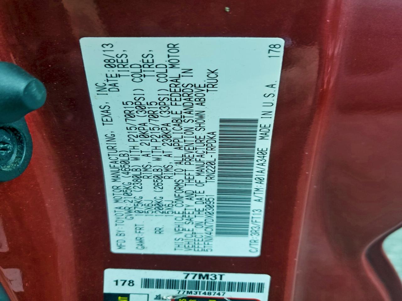Колір ЧервонийЦиліндри 4Привід Задній привідVIN 5TFNX4CN7DX030951Стан НевідомоУшкодження Передня або задня