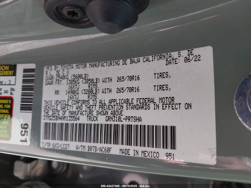 Колір ЗеленийЦиліндри 6Привід Повний привідVIN 3TMDZ5BN4NM******Стан НевідомоУшкодження Передня або задняДата аукціону 2025-08-13