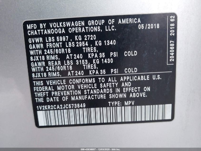 2018 VOLKSWAGEN ATLAS 2018 року Бензин, 3.6, Повний привід, vin - 1V2KR2CA2JC573849 з США