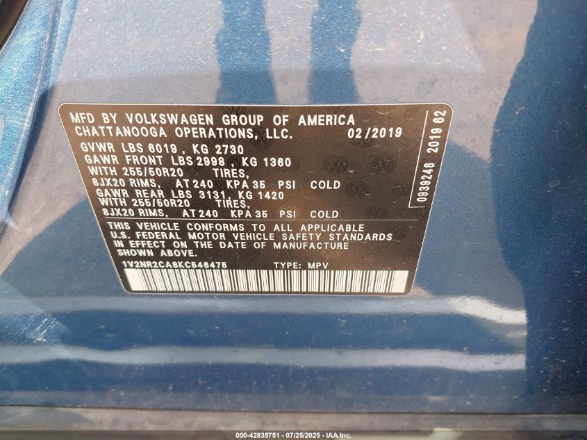 2019 VOLKSWAGEN ATLAS 2019 року Бензин, 3.6, Повний привід, vin - 1V2NR2CA8KC546475 з США