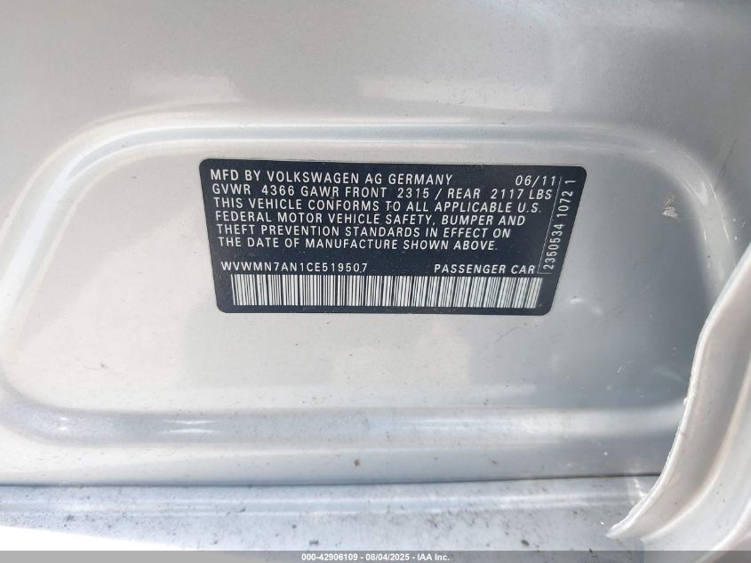 2012 VOLKSWAGEN CC 2012 року Бензин, 2.0, Передній привід, vin - WVWMN7AN1CE519507 з США