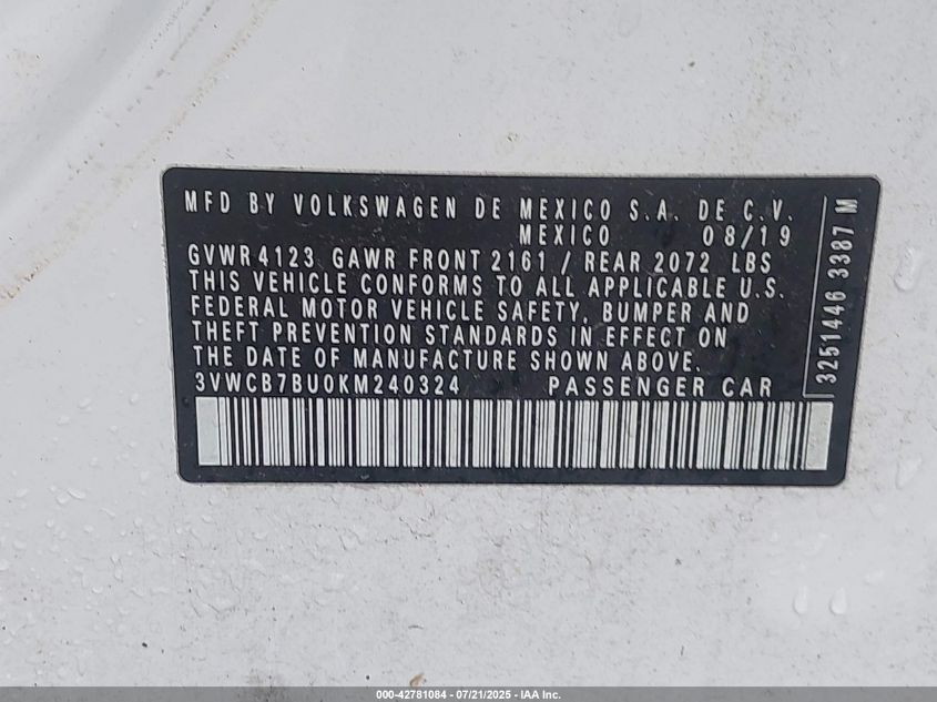 2019 VOLKSWAGEN JETTA 2019 року Бензин, 1.4, Передній привід, vin - 3VWCB7BU0KM240324 з США