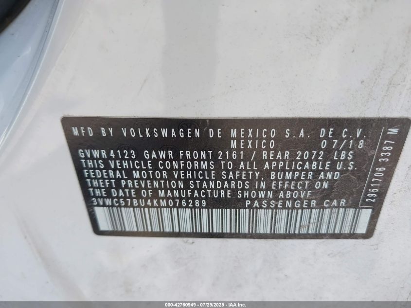 2019 VOLKSWAGEN JETTA S