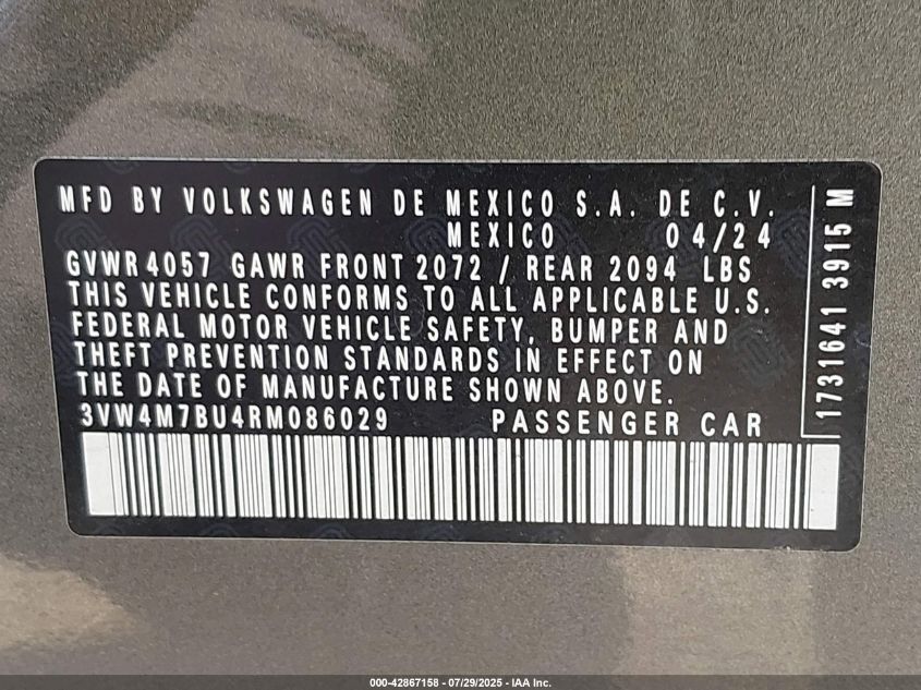 2024 VOLKSWAGEN JETTA 2024 року Бензин, 1.5, Передній привід, vin - 3VW4M7BU4RM086029 з США