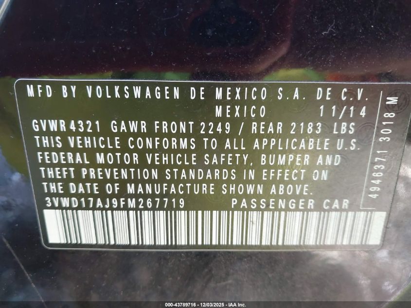 2015 VOLKSWAGEN JETTA 2015 року Бензин, 1.8, Передній привід, vin - 3VWD17AJ9FM267719 з США