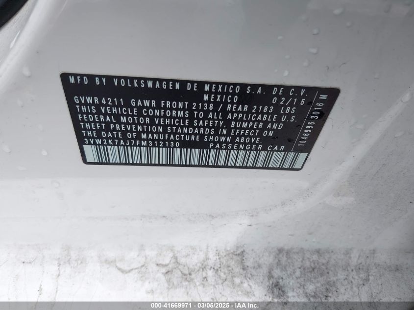 2015 VOLKSWAGEN JETTA 2015 року Бензин, 2.0, Передній привід, vin - 3VW2K7AJ7FM****** з США