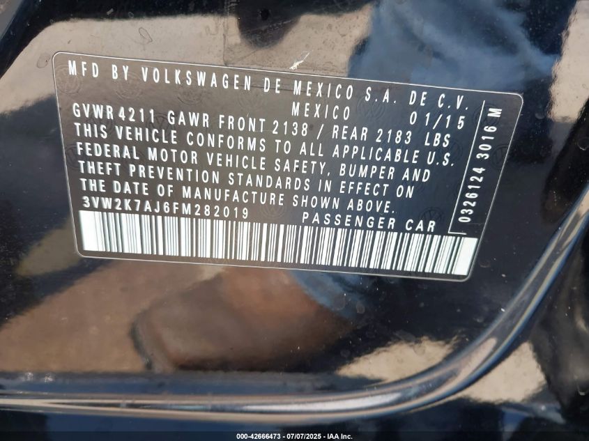 2015 VOLKSWAGEN JETTA 2015 року Бензин, 2.0, Передній привід, vin - 3VW2K7AJ6FM****** з США