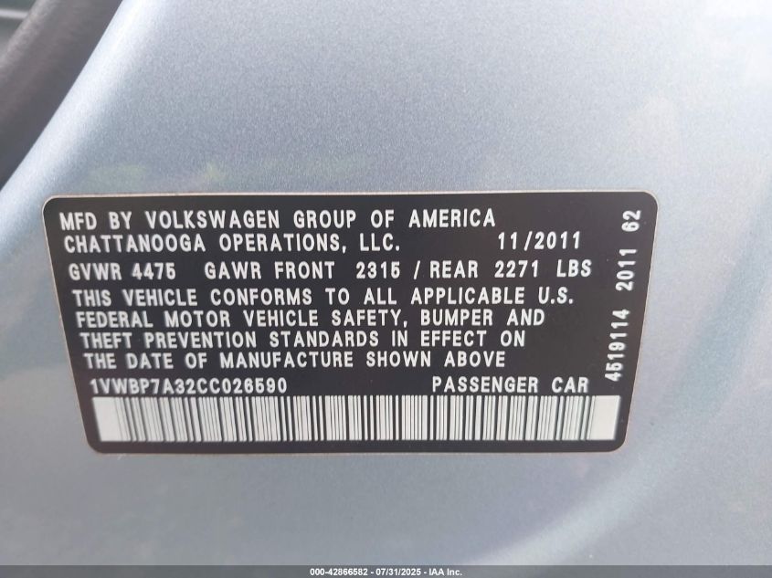 2012 VOLKSWAGEN PASSAT 2012 року Бензин, 2.5, Передній привід, vin - 1VWBP7A32CC****** з США