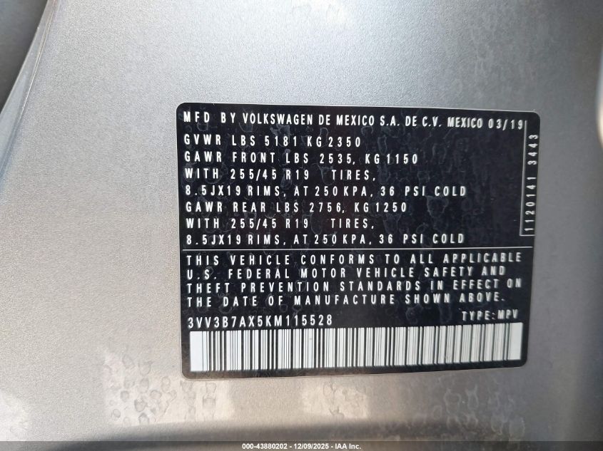2019 VOLKSWAGEN TIGUAN 2019 року Бензин, 2.0, Передній привід, vin - 3VV3B7AX5KM115528 з США