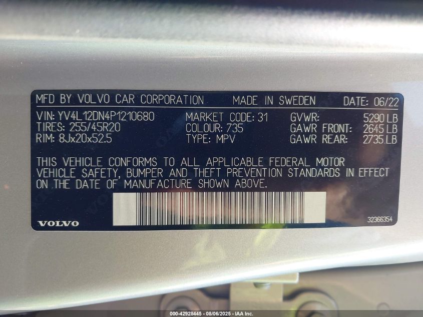 Колір СрібнийЦиліндри 4Привід Передній привідVIN YV4L12DN4P1******Стан НевідомоУшкодження Ліва сторонаДата аукціону 2025-09-17