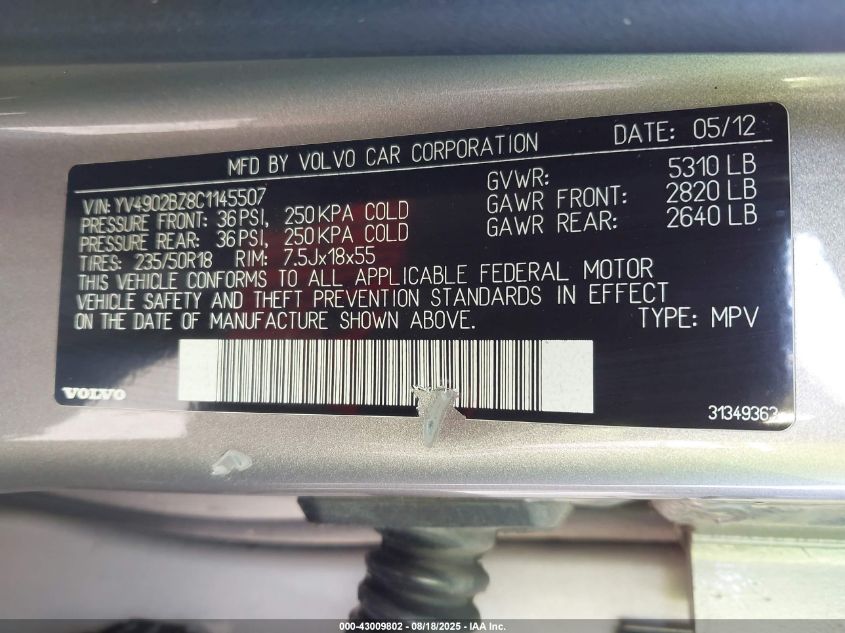 Колір Олов`янийЦиліндри 6Привід Повний привідVIN YV4902BZ8C1******Стан НевідомоУшкодження Передня або задняДата аукціону 2025-09-03